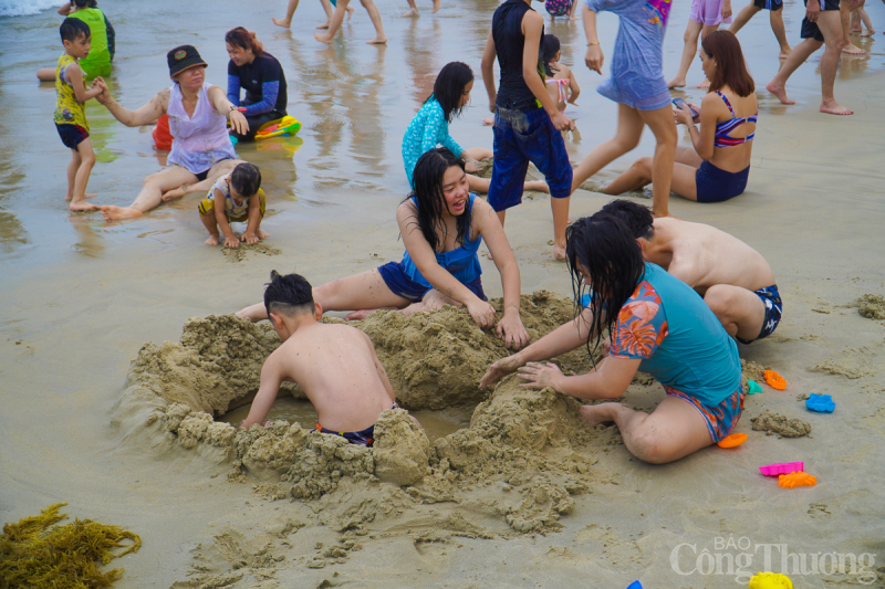 | Du khách thích thú chơi với cát trên bờ biển. |