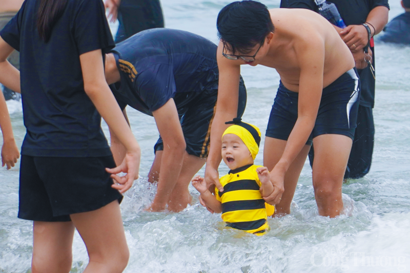 | Các em nhỏ thích thú khi cùng bố mẹ đùa nghịch với từng cơn sóng. |