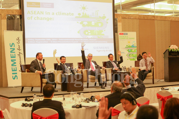 Với cùng quan điểm nêu ra trong bản báo cáo, tại buổi tọa đàm về chủ đề Việt Nam đang làm cách nào để đảm bảo sự ổn định phát triển kinh tế và an ninh năng lượng, đồng thời thúc đẩy hệ thống năng lượng ít các-bon và vai trò của khu vực tư nhân trong lĩnh vực này, 5 diễn giả gồm: Tiến sỹ Phạm Thái Lai - Chủ tịch kiêm Tổng giám đốc Siemens Việt Nam; ông Phạm Văn Tấn - Phó Cục trưởng Cục Khí tượng thủy văn và biến đổi khí hậu kiêm Phó Trưởng ban Công tác đàm phán biến đổi khí hậu Việt Nam (Bộ Tài nguyên và Môi trường); ông Nguyễn Ninh Hải - Phó Vụ trưởng Vụ Năng lượng mới và năng lượng tái tạo (Bộ Công Thương); ông Franz Gerner - Trưởng ban Kinh tế năng lượng của Ngân hàng Thế giới và tiến sỹ Andy Staples - Giám đốc của Economist Corporate Network tại khu vực Đông Nam Á - đã cùng nhấn mạnh vai trò của khu vực tư nhân trong việc thúc đẩy cuộc chiến chống biến đổi khí hậu.