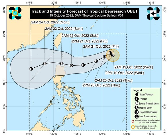 Theo dự báo của Pagasa, áp thấp nhiệt đới có xu thế phát triển mạnh lên thành bão vào ngày 22-10, dự kiến sẽ tiếp tục di chuyển theo hướng tây tới khu vực Biển Đông vào khoảng ngày 22 đến 23-10.