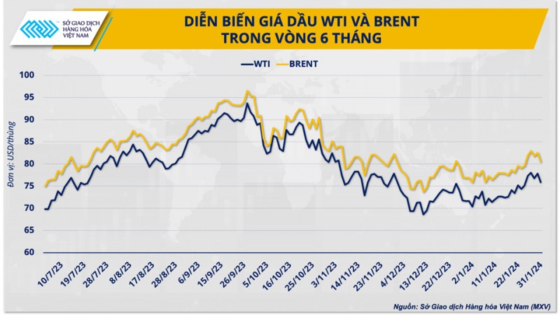 Điều này cũng đã tác động tới diễn biến giá dầu. Theo dữ liệu của Sở Giao dịch Hàng hóa Việt Nam (MXV), giá dầu đã đạt đỉnh hai tháng trong tuần kết thúc ngày 28/1, với dầu WTI lên sát mốc 80 USD/thùng. Hiện tại, giá dầu WTI vẫn đang dao động trên 75 USD/thùng, tăng hơn 11% trong hai tháng qua trước rủi ro quanh Biển Đỏ.