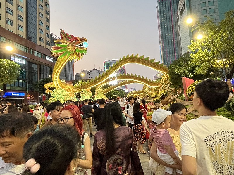 Theo ghi nhận của phóng viên Báo Công Thương trong tối 30 tháng Chạp (nhằm ngày 9/2/2024), hiện các khu vực trung tâm quận 1, TP. Hồ Chí Minh rất đông đúc, trong đó tuyến phố đi bộ Nguyễn Huệ và Lê Lợi đông nghẹt người dân đổ về vui chơi để vừa checkin đường hoa, tham quan hội sách vừa chọn vị trí đẹp chờ xem bắn pháo hoa đón Giao thừa.