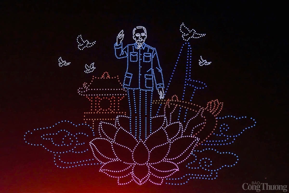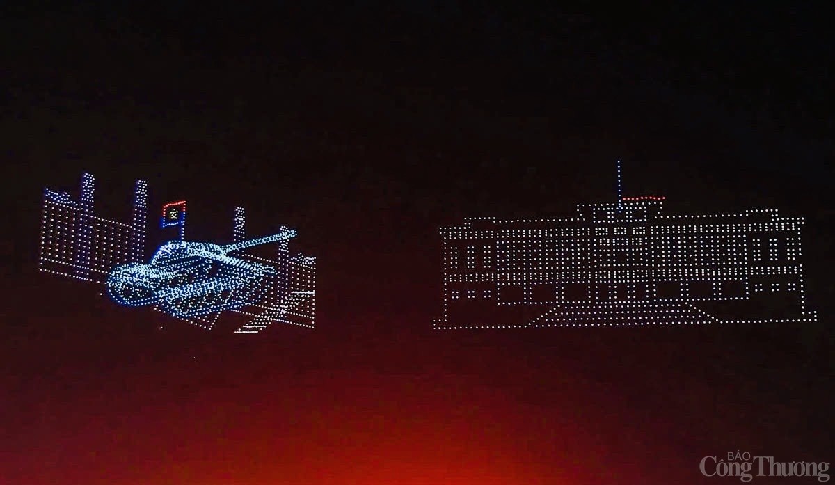Trong suốt màn trình diễn, bầu trời thành phố trở thành bức tranh sống động, nơi công nghệ và ký ức cùng song hành: Hình ảnh xe tăng 390 húc tung cổng Dinh Độc Lập, chân dung Bác Hồ rạng ngời, biểu tượng tuyến metro số 1 - tuyến đường sắt đô thị đầu tiên của thành phố, lần lượt hiện lên đầy xúc động.