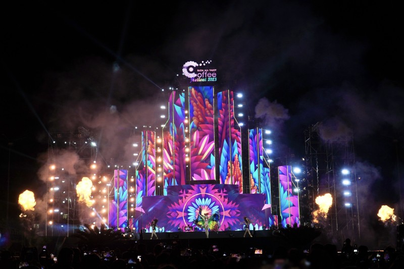 | Sân khấu lễ hội gây ấn tượng mạnh mẽ với khán giả khi kết hợp hài hòa giữa nghệ thuật thị giác và chiều sâu văn hóa Tây Nguyên. |