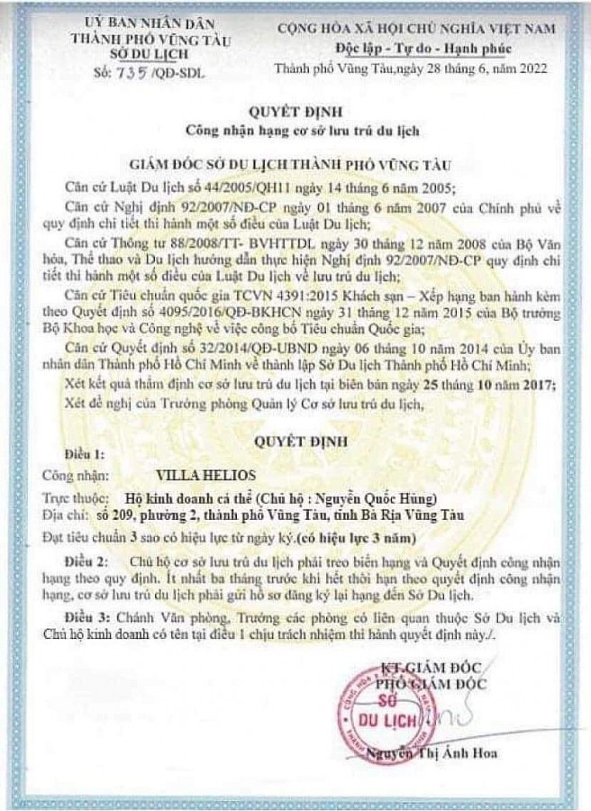 | Quyết định công nhận đạt chuẩn 3 sao mà "Villa Helios" đưa lên mạng để mọi người tin tưởng là giấy tờ giả vì đơn vị cấp giấy là "Sở Du lịch thuộc UBND TP Vũng Tàu", trong khi TP này thuộc tỉnh Bà Rịa - Vũng Tàu và tất nhiên không có cấp sở. Người ký quyết định là Nguyễn Thị Ánh Hoa - phó giám đốc - cũng không có ở Sở Du lịch tỉnh Bà Rịa - Vũng Tàu. |