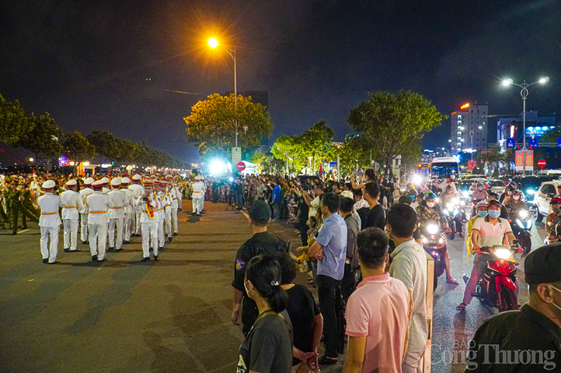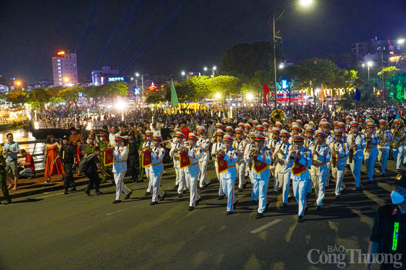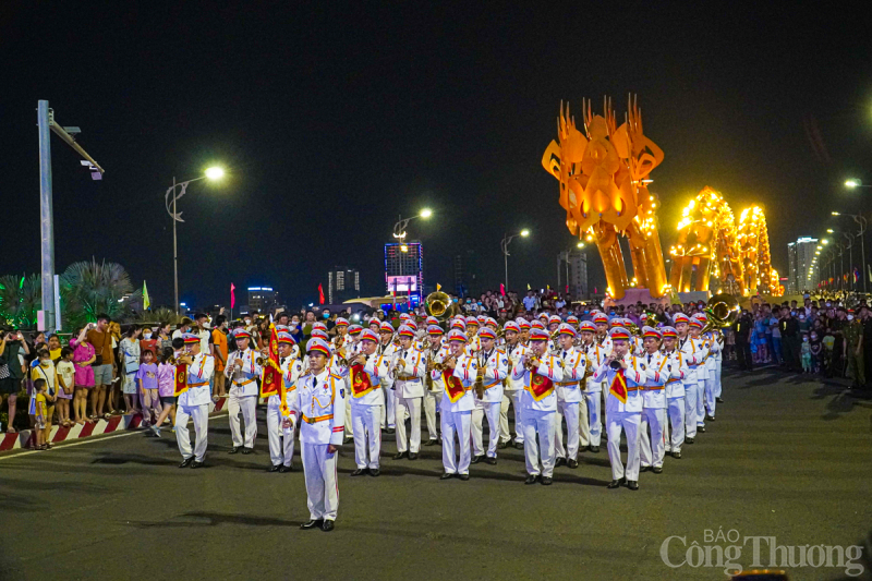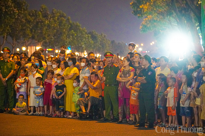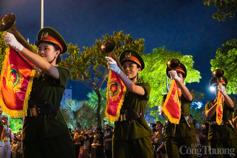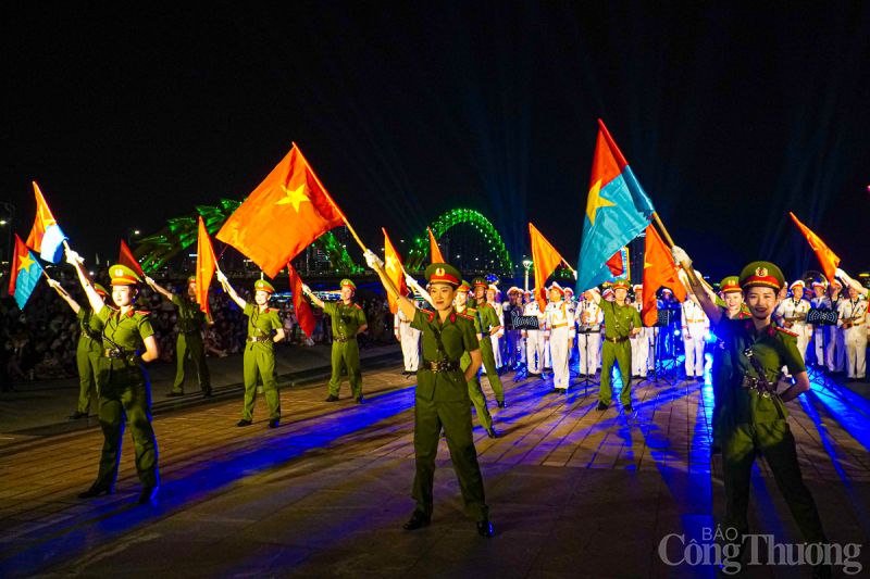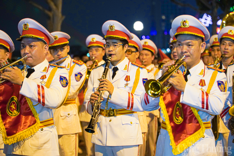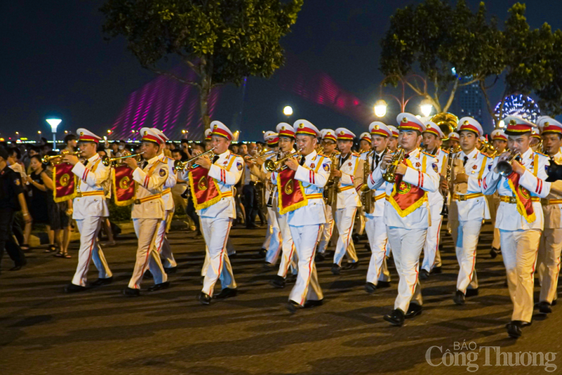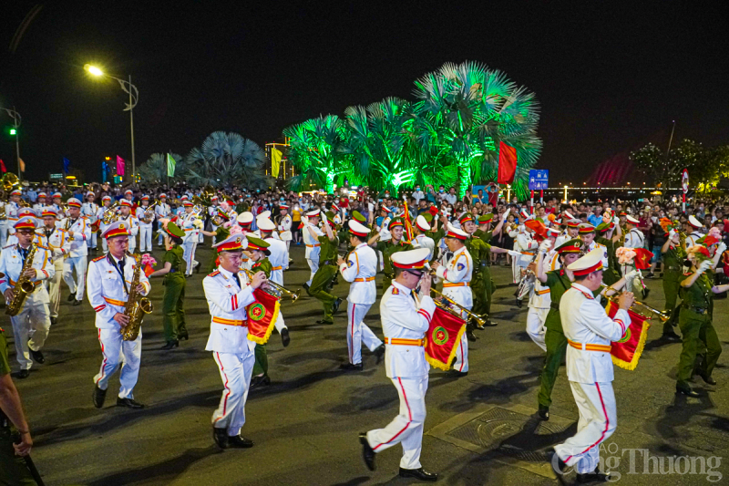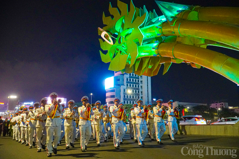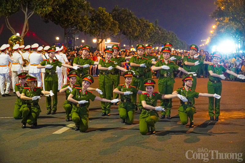 | Tối 29/4, tại thành phố Đà Nẵng, Đoàn Nghi lễ Công an Nhân dân tổ chức trình diễn các tác phẩm nghệ thuật phục vụ người dân và du khách trên tuyến đường Bạch Đằng (từ cầu Trần Thị Lý đến Cầu Rồng). |