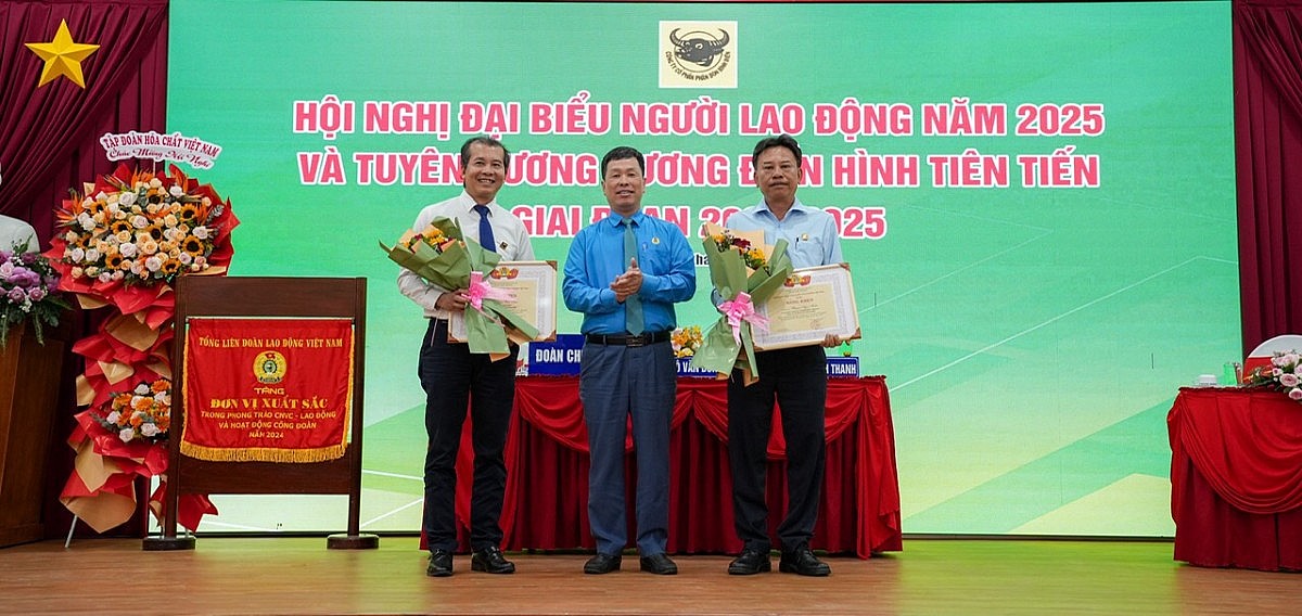 Ông Phạm Văn Tâm – Đảng ủy viên, Phó Tổng Giám đốc Công ty CP Phân bón Bình Điền (bìa trái) và Ông Phạm Ngọc Tuấn – Bí thư Đảng ủy, Giám đốc Công ty CP Bình Điền – MeKong (bìa phải) nhận Bằng khen “Đã có thành tích xuất sắc trong phong trào thi đua lao động giỏi và xây dựng tổ chức Công đoàn vững mạnh năm 2024” của Công đoàn Công thương Việt Nam. Ảnh: Công ty cung cấp |