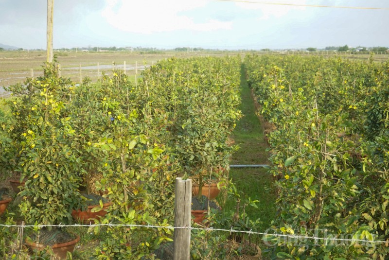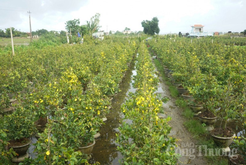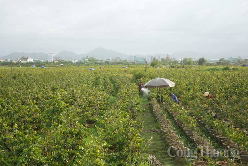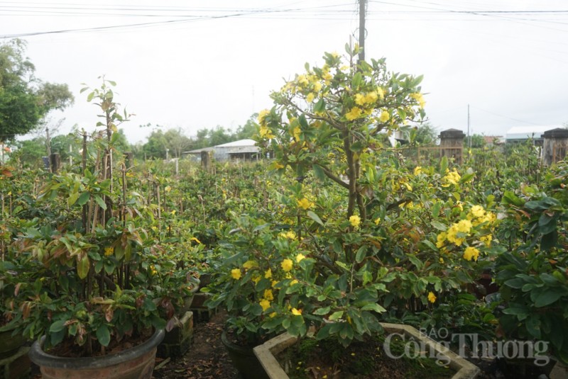 Nhiều hộ trồng mai ở các thôn Trung Định, Háo Đức, Thanh Liêm (của xã Nhơn An) cũng rơi vào tình cảnh tương tự. Nhiều vườn mai hơn trăm chậu cũng đã nở rộ. |
