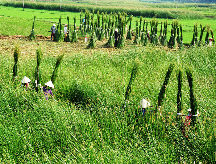| Thu hoạch cói trên cánh đồng xanh mướt bên quốc lộ 1, xã Hoài Châu Bắc |