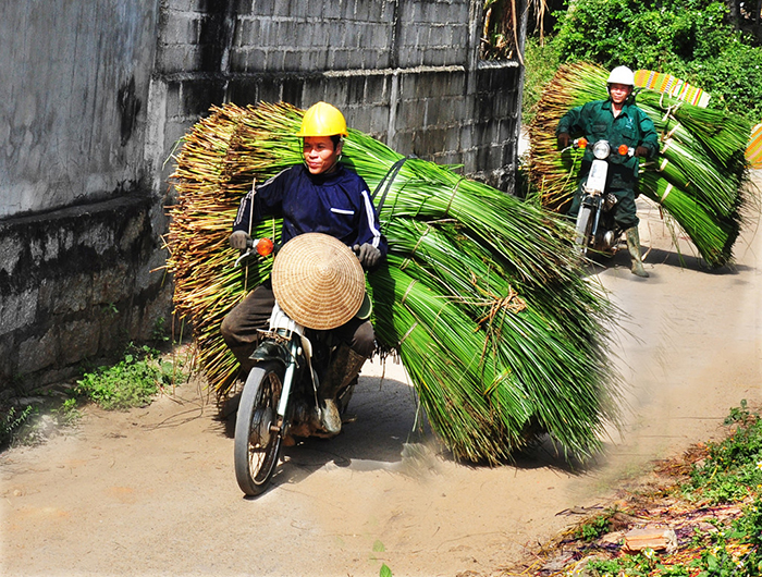 | Bà con dùng xe máy vận chuyển nguyên liệu cói về nhà |