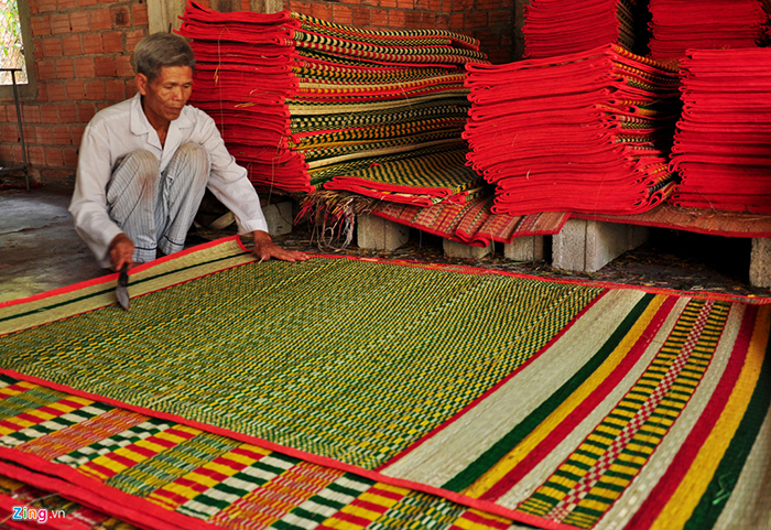 dùng chiếu trắng trong mỗi lần cúng bái. Dệt chiếu hoa công phu hơn nhiều. Bà con lấy phẩm nấu lên và nhúng sợi cói vào, nhúng từng nạm một và đem phơi khô, sau đó mới đem dệt thành chiếu hoa. Với mẫu chiếu có chữ “thọ”, chữ “song hỷ”, hoặc chữ “trăm năm hạnh phúc”; bốn góc chiếu có hoa văn trang trí thì tượng trưng cho sự sung túc, may mắn, hạnh phúc nên rất được ưa chuộng trong dịp lễ tết, cưới hỏi.