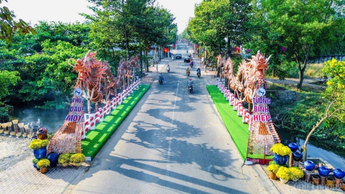 | Linh vật hai chú rồng được tạo hình với hàng trăm chiếc lu gốm nung thủ công, đặt ở hai bên đường đi vào làng nghề gốm sứ Tương Bình Hiệp - một trong những làng nghề gốm cổ xưa nhất ở Bình Dương, vừa được xác lập kỷ lục Việt Nam |