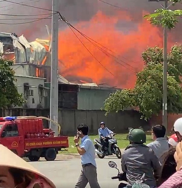 Tại hiện trường, nhà xưởng vẫn đang cháy dữ dội, khói đen bao trùm. Do bên trong chứa nhiều vật liệu dễ cháy nên khiến ngọn lửa bùng phát mạnh, trong đám cháy phát ra nhiều tiếng nổ lớn.