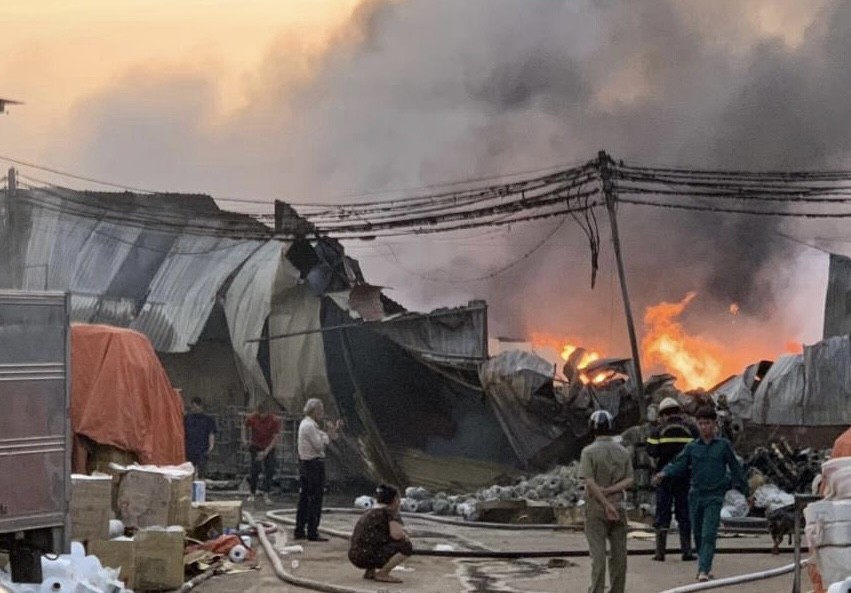 Do nhà xưởng chứa nhiều vật liệu dễ cháy nên ngọn lửa bùng phát dữ dội, lan rộng. Lực lượng chữa cháy đã chia thành nhiều hướng phun nước, khống chế đám cháy.