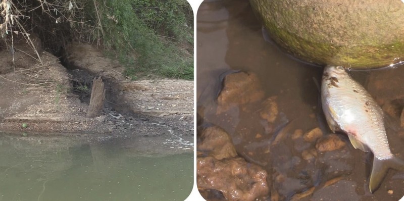 | Xung quanh vị trí xả thải của trại heo này phát hiện có cá chết. |