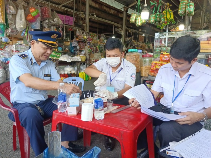 | Đoàn kiểm tra liên ngành chức năng tỉnh Bình Dương lấy mẫu test nhanh các mặt hàng thực phẩm thiết yếu tại các chợ truyền thống trên địa bàn tỉnh |