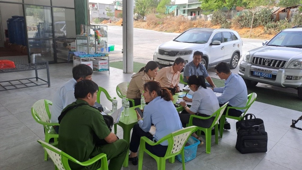 | Đoàn công tác của Sở Y tế tỉnh Bình Thuận làm việc với chủ cơ sở nơi đoàn du khách dùng bữa (Ảnh: BBT) |