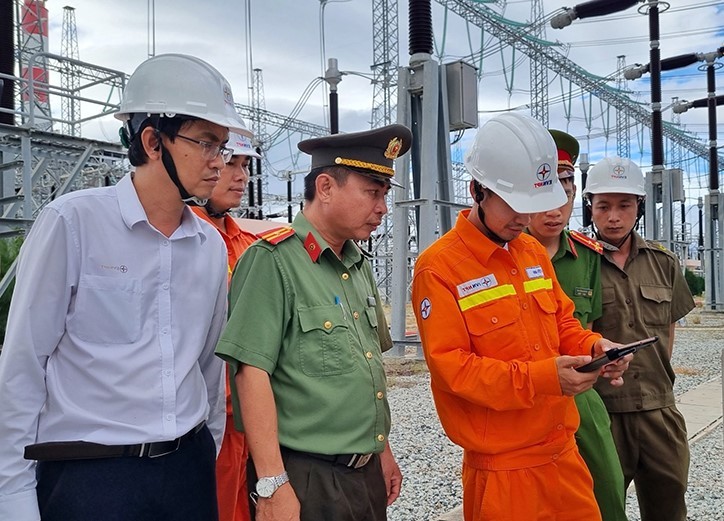 | Lực lượng chức năng tỉnh Bình Thuận phối hợp kiểm tra an toàn tại Trạm biến áp 500kV Vĩnh Tân - (Ảnh: Công an Bình Thuận) |