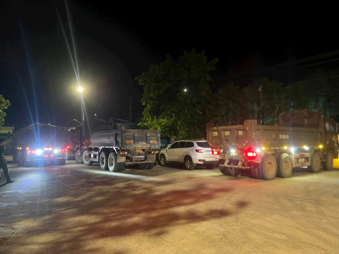 | Các xe tải ben đầy ắp khoáng sản, chuẩn bị đi tiêu thụ - (Ảnh: Nguyễn Luân). |