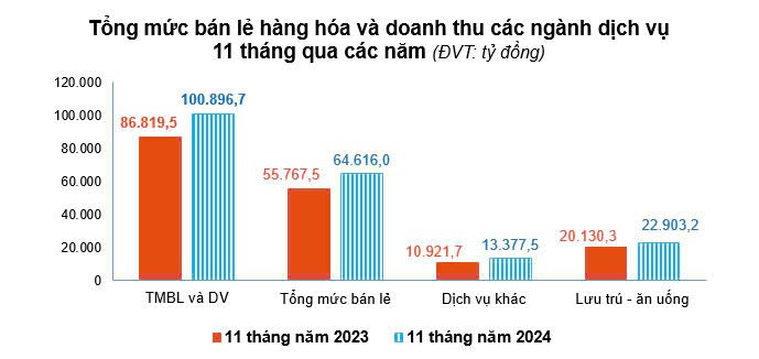 Tổng mức bán lẻ hàng hóa và doanh thu các ngành dịch vụ trong tháng 11 đạt gần 10.000 tỷ đồng, tăng gần 2% so với tháng trước và tăng hơn 14% so với cùng kỳ năm trước. Trong đó, tổng mức bán lẻ hàng hoá đạt hơn 6.300 tỷ đồng, tăng so với tháng trước và tăng hơn 13% so với cùng kỳ năm trước.