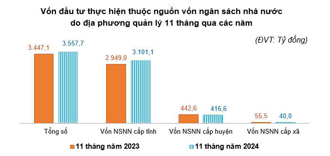 Hoạt động sản xuất kinh doanh của các doanh nghiệp trong tháng tiếp tục được duy trì ổn định, các hoạt động xúc tiến đầu tư tiếp tục được đẩy mạnh. Vốn đầu tư thực hiện thuộc nguồn vốn ngân sách nhà nước do địa phương quản lý trong tháng ước đạt hơn 540 tỷ đồng, tăng hơn 16% so với tháng trước và tăng nhẹ so với cùng kỳ năm trước. Lũy kế 11 tháng năm 2024 ước đạt hơn 3.500 tỷ đồng, tăng hơn 3% so với cùng kỳ năm trước và đạt gần 70% so với kế hoạch năm.