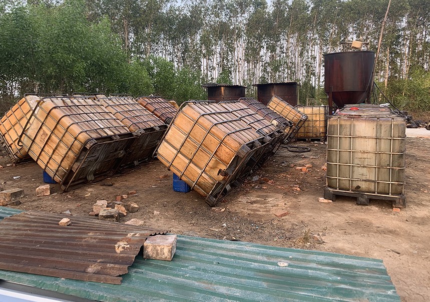 Tại đây, công an đã phát hiện khoảng 7.000 lít dầu nhớt thành phẩm không có nhãn mác; 4.000 lít nguyên liệu là nhớt thải được chứa trong các thùng nhựa có thể tích 1m3/thùng; 10 thùng phuy chất thải rắn và toàn bộ hệ thống máy móc, thiết bị, dung dịch phục vụ cho hoạt động tái chế.