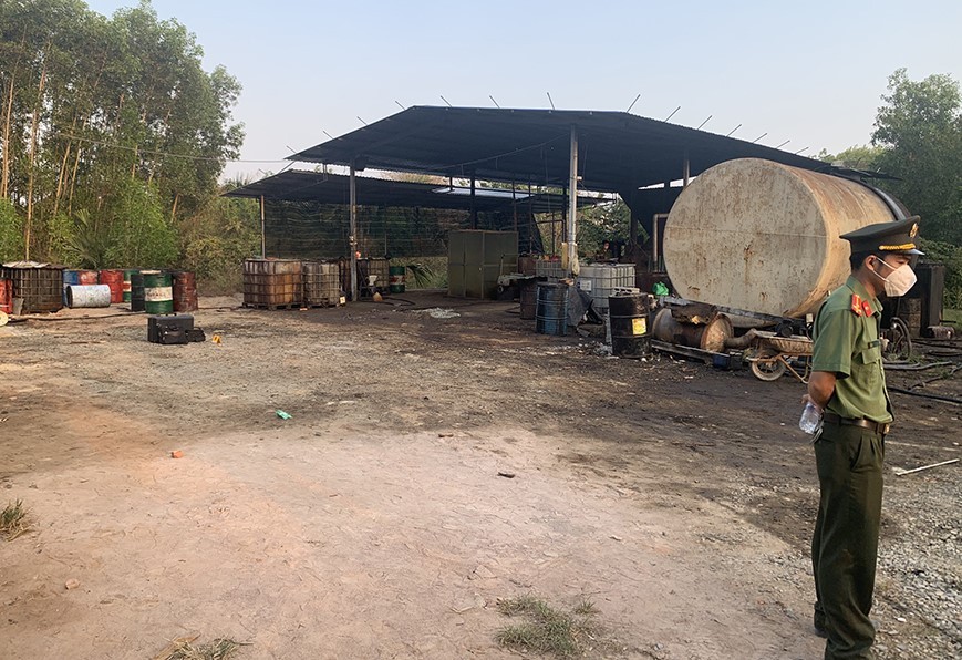 | Công an huyện Hàm Tân kiểm tra xưởng tải chế nhớt thải trái phép (Ảnh: CABT) |