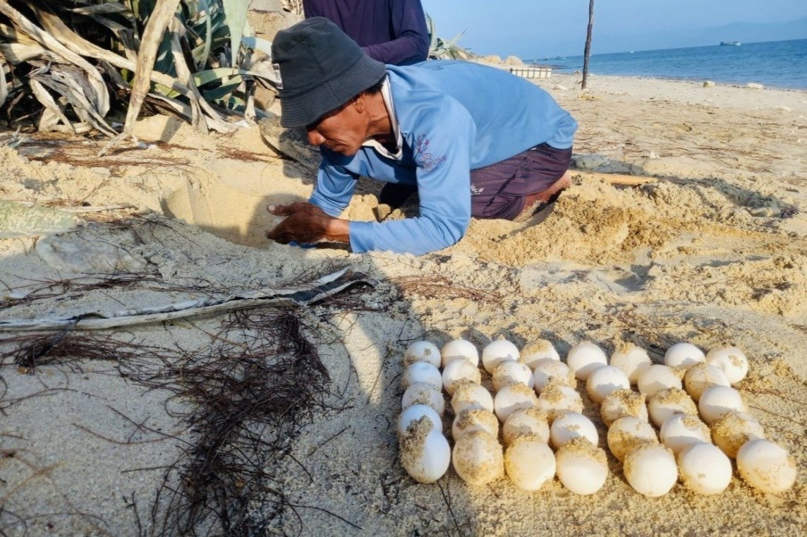 | Nhân viên Khu bảo tồn biển Hòn Cau đã thu gom, bảo quản và di dời toàn bộ số trứng về nơi bãi đẻ an toàn |
