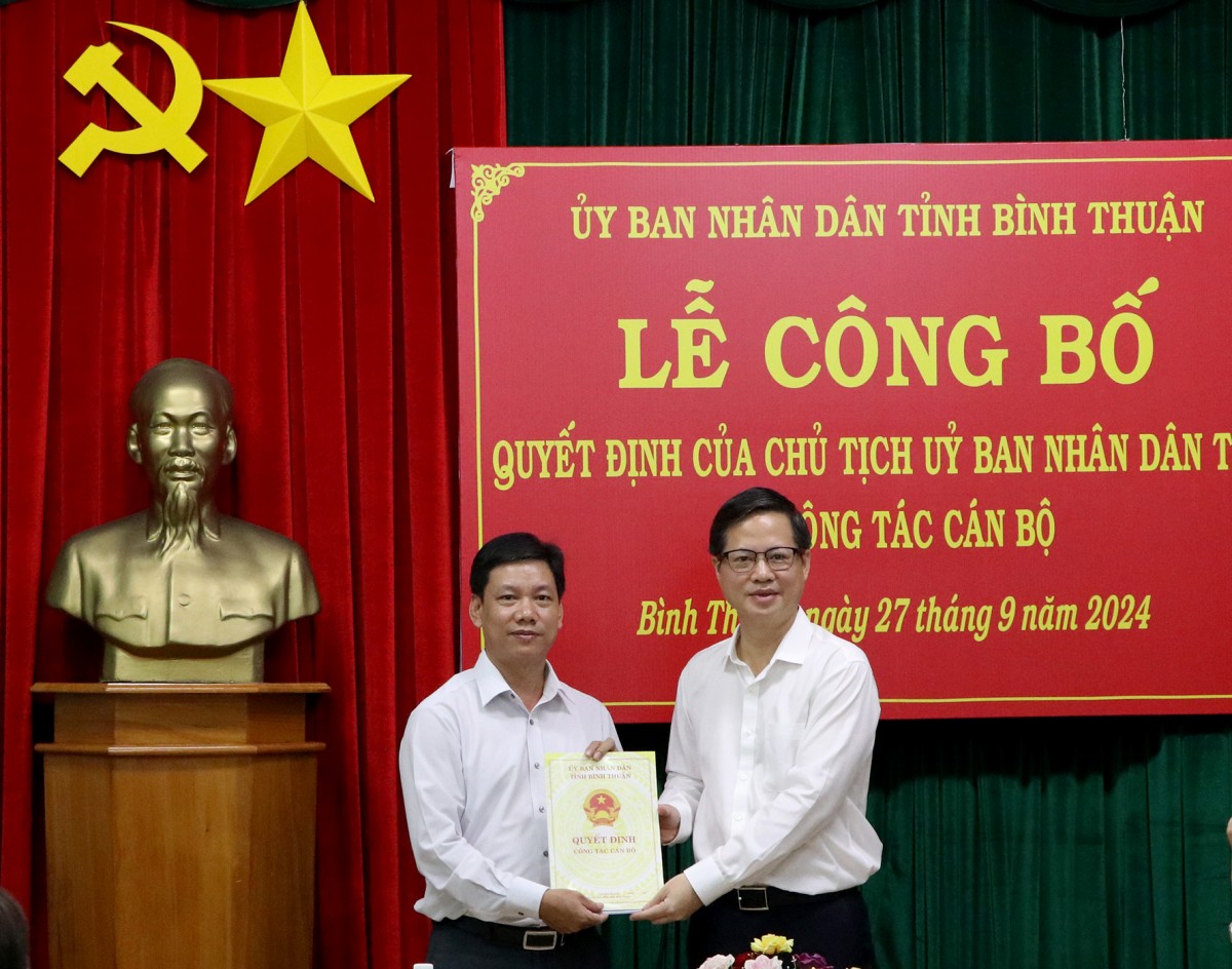 | Chủ tịch UBND tỉnh Bình Thuận Đoàn Anh Dũng trao quyết định bổ nhiệm tân Giám đốc Sở Nội vụ tỉnh Bình Thuận (trái) - Ảnh: UBND tỉnh |