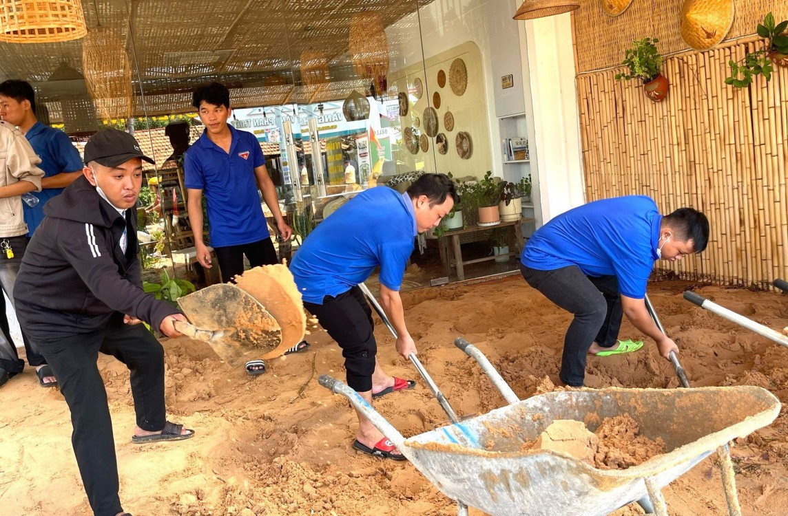 | Đoàn viên, thanh niên TP. Phan Thiết hỗ trợ người dân dọn cát - Ảnh: T.Linh |