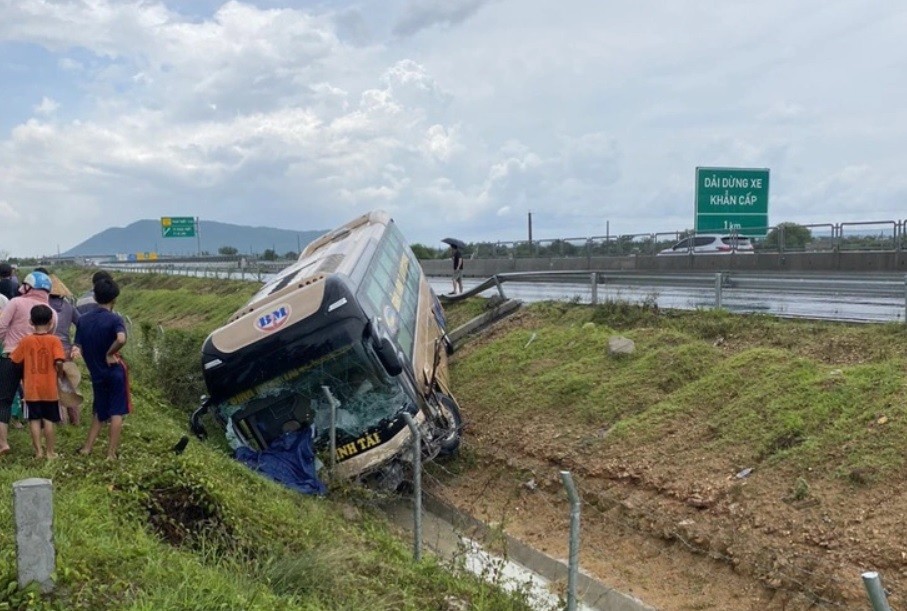 | Xe khách lao xuống mương thoát nước sau va chạm với ô tô trên cao tốc Vĩnh Hảo - Phan Thiết - (Ảnh: Mai Thức) |