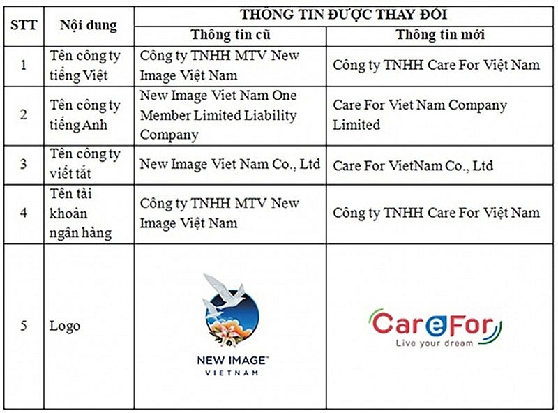 Về mặt pháp lý, việc đổi tên Công ty không làm ảnh hưởng đến bất kỳ quan hệ dân sự, giao dịch kinh tế nào của Công ty TNHH Care For Việt Nam (trước đây là Công ty TNHH MTV New Image Việt Nam).