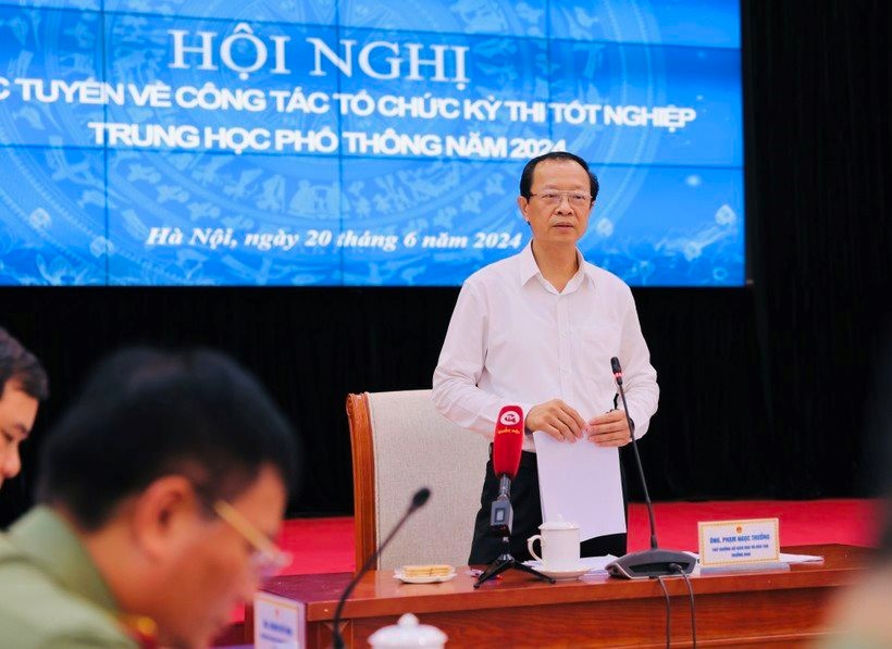 Để kỳ thi được diễn ra an toàn, Thứ trưởng Bộ Giáo dục Đào tạo Phạm Ngọc Thưởng đề nghị tất cả Ban Chỉ đạo cấp tỉnh, thành phố tiếp tục quán triệt một cách đầy đủ, sâu sắc, nghiêm túc và cụ thể hóa những nhiệm vụ mà Thủ tướng đã nêu trong Chỉ thị số 15 ngày 16/5/2024. Trong đó nêu rất rõ đối với nhiệm vụ của Bộ Giáo dục Đào tạo, đối với UBND các tỉnh thành phố, kèm theo nhiệm vụ của các bộ ngành, liên quan như: Công an, Viễn thông, Giao thông vận tải, Y tế...