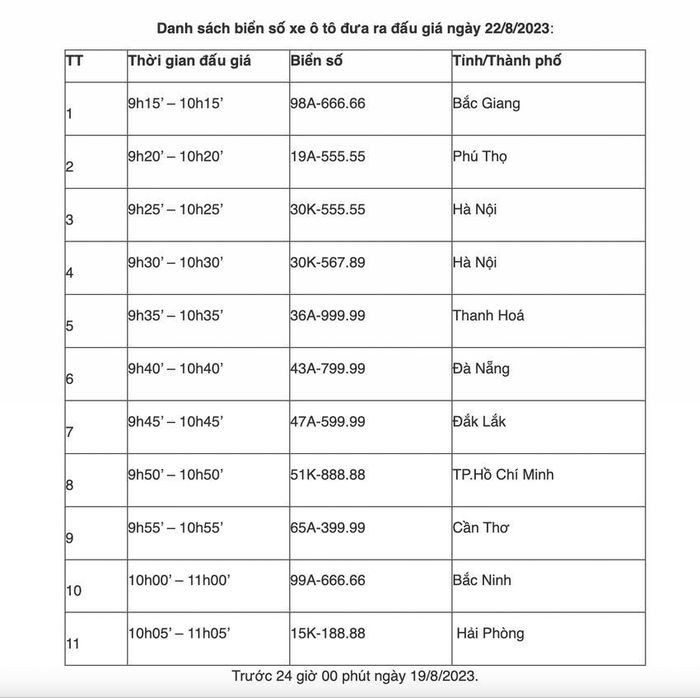 | Danh sách 11 biển số đẹp sẽ được đấu giá vào ngày 22/8 |