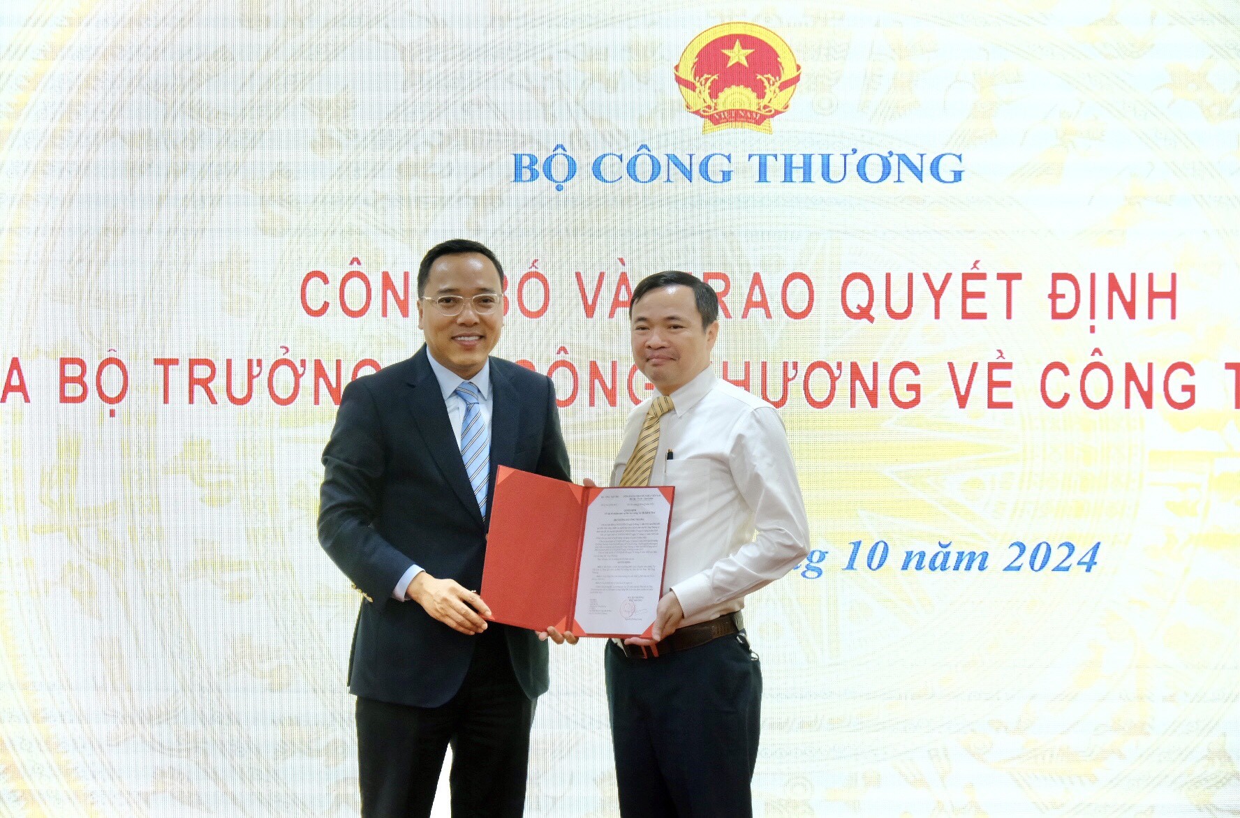 | Thứ trưởng Bộ Công Thương Nguyễn Hoàng Long trao quyết định bổ nhiệm của Bộ trưởng Bộ Công Thương đối với đồng chí Đặng Hải Anh. Ảnh: Trần Đình |