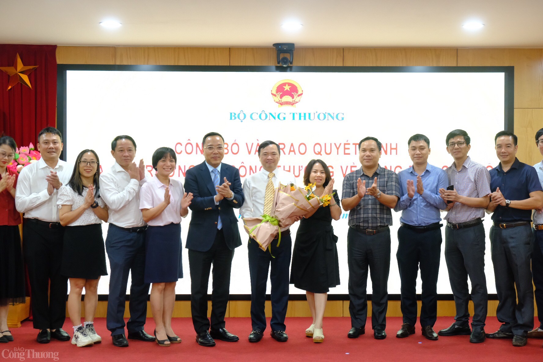 | Thứ trưởng Nguyễn Hoàng Long, đại diện Vụ Tổ chức cán bộ Bộ Công Thương và tập thể Vụ Dầu khí và Than chúc mừng tân Phó Vụ trưởng Vụ Dầu khí và Than. Ảnh: Trần Đình |