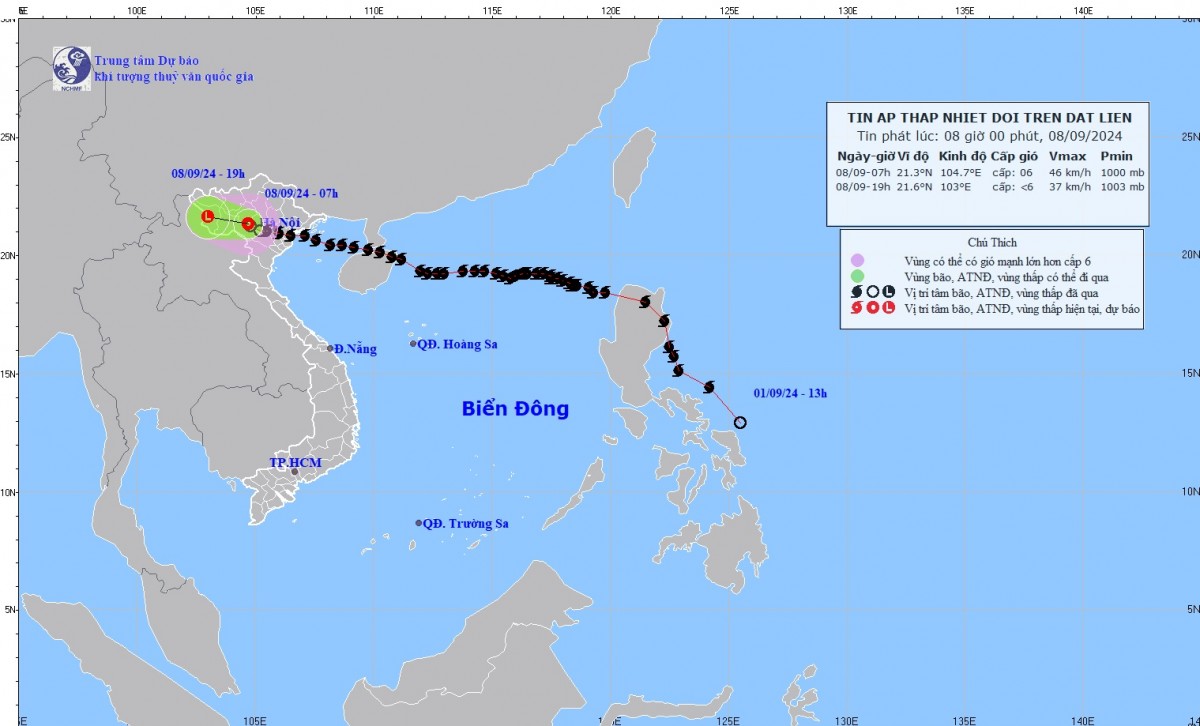 Hồi 4h00 ngày 8/9, vị trí tâm áp thấp nhiệt đới ở vào khoảng 21,2 độ Vĩ Bắc; 104,8 độ Kinh Đông, trên đất liền khu vực phía Tây Bắc Bộ. Sức gió mạnh nhất vùng gần tâm áp thấp nhiệt đới mạnh cấp 6 (39-49km/h), giật cấp 7, di chuyển theo hướng Tây, tốc độ 10-15km/h.