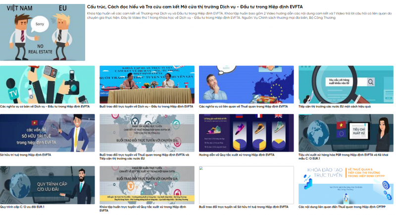Theo đó, tại Mục đào tạo trực tuyến của Cổng thông tin FTAP (https://fta.gov.vn/), Vụ Chính sách thương mại đa biên, Bộ Công Thương đã cung cấp, đăng tải các video ngắn, trực quan, sinh động, doanh nghiệp có thể tìm hiểu về Hiệp định Hiệp định thương mại tự do Việt Nam - châu Âu (EVFTA), CPTPP, UKVFTA một cách thuận lợi nhất.