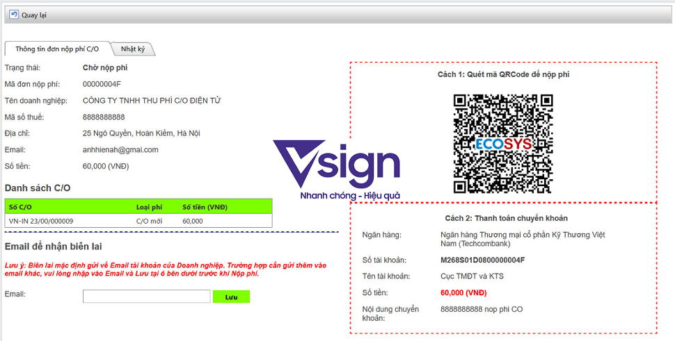 Ngoài ra, để đảm bảo việc hỗ trợ được thuận tiện, doanh nghiệp có thể gửi yêu cầu tới Vsign.vn để hỗ trợ chuyên sâu hơn trong quá trình gặp vướng mắc về nộp phí C/O này thông qua 03 số điện thoại hỗ trợ: Hotline: (024) 62705538 - Hà Nội (024) 22205513 - Hồ Chí Minh (028) 39152880 và email: [email protected]