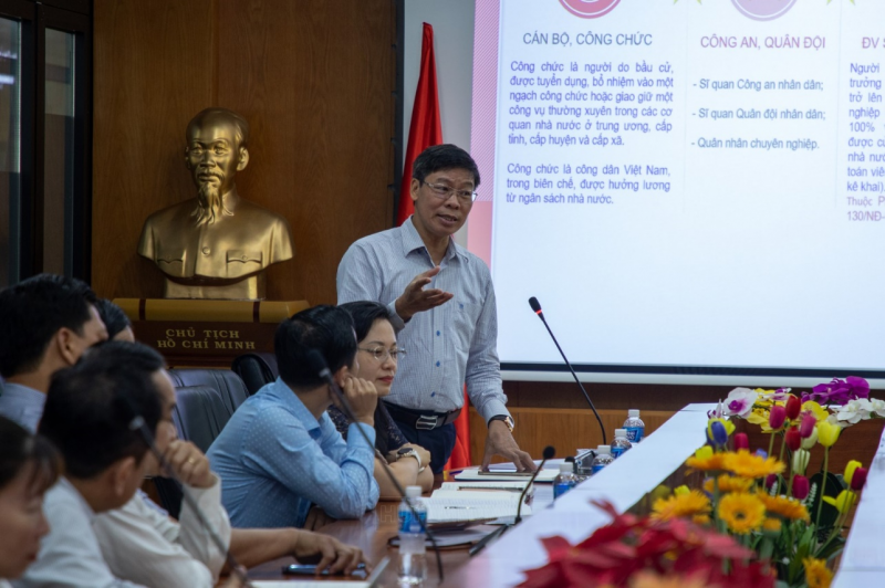 Căn cứ những quy định của pháp luật, TS. Lê Việt Long đã hướng dẫn chi tiết về công tác kê khai tài sản, thu nhập cho gần 100 cán bộ, đảng viên thuộc diện phải kê khai của trường tham gia như các hình thức kê khai, một số điểm cần lưu ý khi kê khai, truyền đạt và hướng dẫn những nội dung cơ bản của Luật Phòng chống tham nhũng 2018.