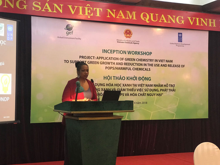 Tại hội thảo khởi động bà Christine Wellington Moore- Cố vấn chương trình của UNDP đã giới thiệu tổng thể các hoạt động, khung kết quả của dự án cũng như từng hợp phần sẽ được triển khai trong suốt 3 năm. Thông qua đó, Dự án mong muốn nhận được sự tham gia góp ý của các đại biểu đối với từng hoạt động của dự án . “Hóa học xanh không phải mới nhưng đây là vấn đề không dễ thực hiện, nên chúng tôi mong muốn nhận được ý kiến của các bên liên quan trong hội thảo ngày hôm nay. Có những thông tin, dữ liệu đầu vào của các chất nguy hại chúng tôi vẫn để trống vì chúng ta rất khó để đưa ra số liệu chính xác, do vậy chúng tôi thống nhất cuối dự án kết quả giảm bao nhiêu POPs, CO2… mới được đưa vào”.