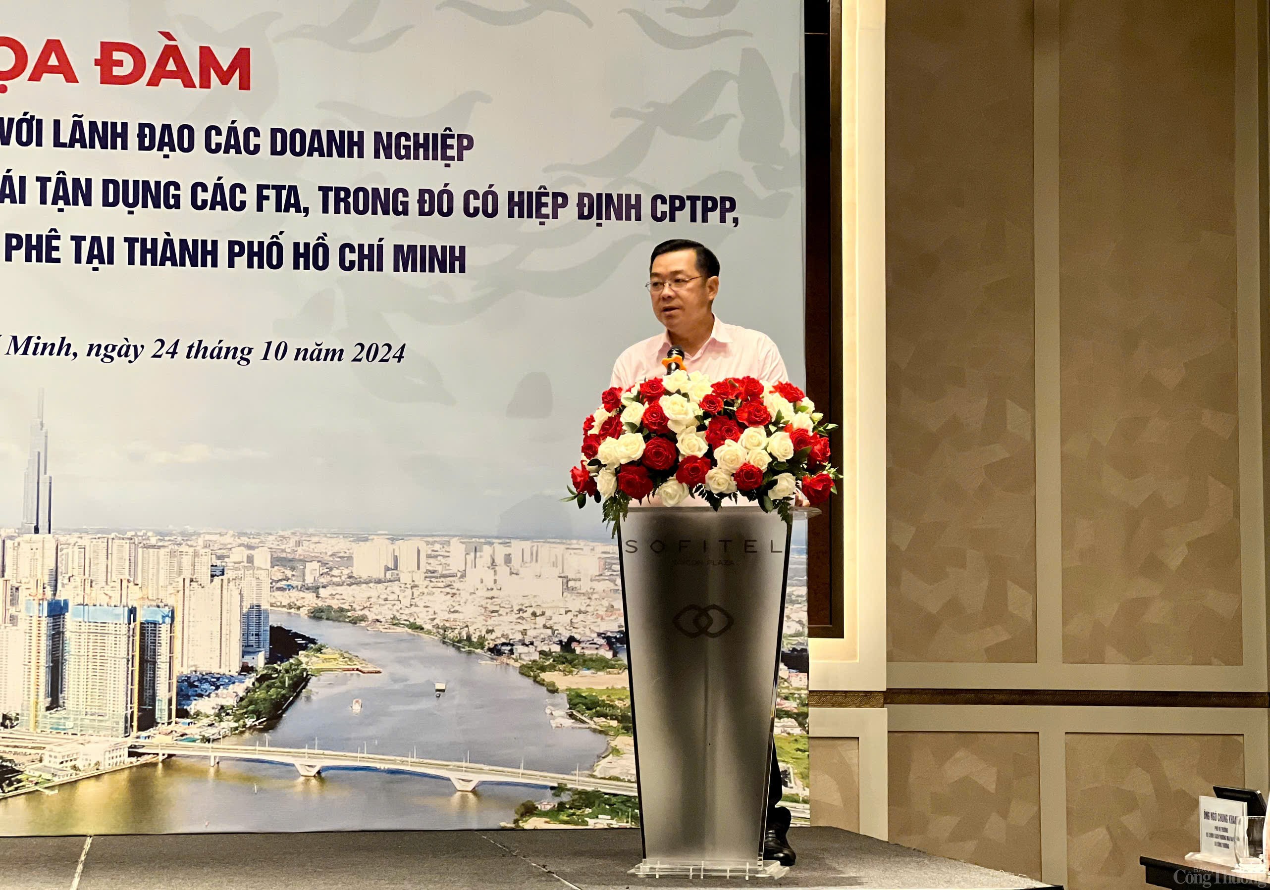 | Toạ đàm trao đổi trực tiếp với lãnh đạo các doanh nghiệp tại các tỉnh, thành phố về hệ sinh thái tận dụng các FTA, trong đó có hiệp định CPTPP trong lĩnh vực cà phê tại TP. Hồ Chí Minh. |
