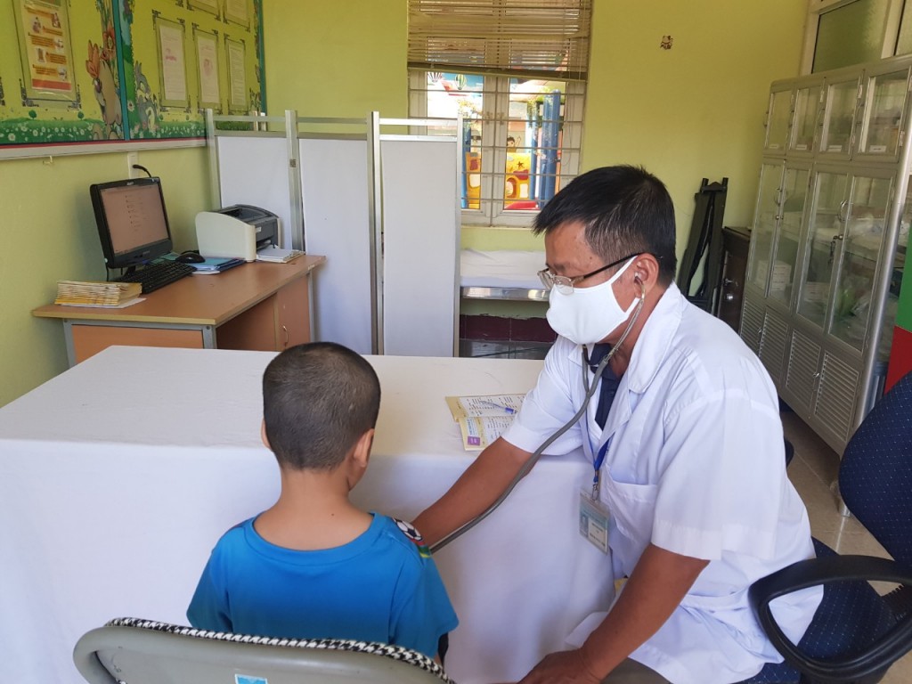 | Nhân viên y tế Trường Mầm non thị trấn Quảng Hà (huyện Hải Hà, tỉnh Quảng Ninh) kiểm tra sức khỏe cho học sinh |