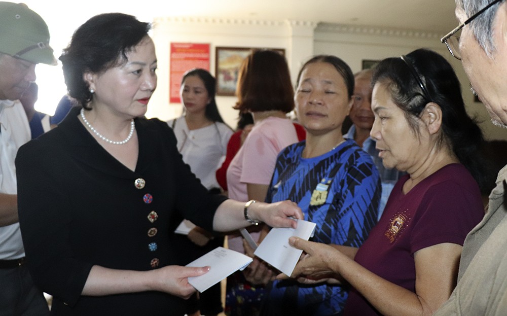 Đồng chí Phạm Thị Thanh Trà, Ủy viên Trung ương Đảng, Bí thư Ban Cán sự đảng, Bộ trưởng Bộ Nội vụ ủng hộ đồng bào bị thiệt hại do cơn bão số 3. Ảnh: Tổ chức Nhà nước |