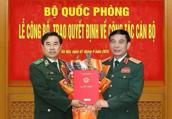 | Đại tướng Phan Văn Giang, Ủy viên Bộ Chính trị, Bộ trưởng Quốc phòng, trao quyết định cho Thiếu tướng Võ Tiến Nghị. |