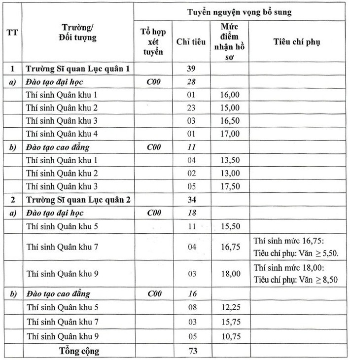Theo thông báo của Bộ Quốc phòng, đối tượng thí sinh đăng ký xét tuyển bổ sung theo nhóm xét tuyển quy định tại Điểm b, Khoản 3, Điều 27 Thông tư số 31; tuyển bổ sung thí sinh đủ điều kiện sơ tuyển các trường thuộc nhóm 1, gồm các học viện: Hậu cần, Hải quân, Biên phòng, Phòng không - Không quân (hệ Chỉ huy tham mưu) và các trường sĩ quan: Lục quân 1, Lục quân 2, Chính trị, Đặc công, Pháo binh, Tăng thiết giáp, Phòng hóa, Thông tin, Công binh.
