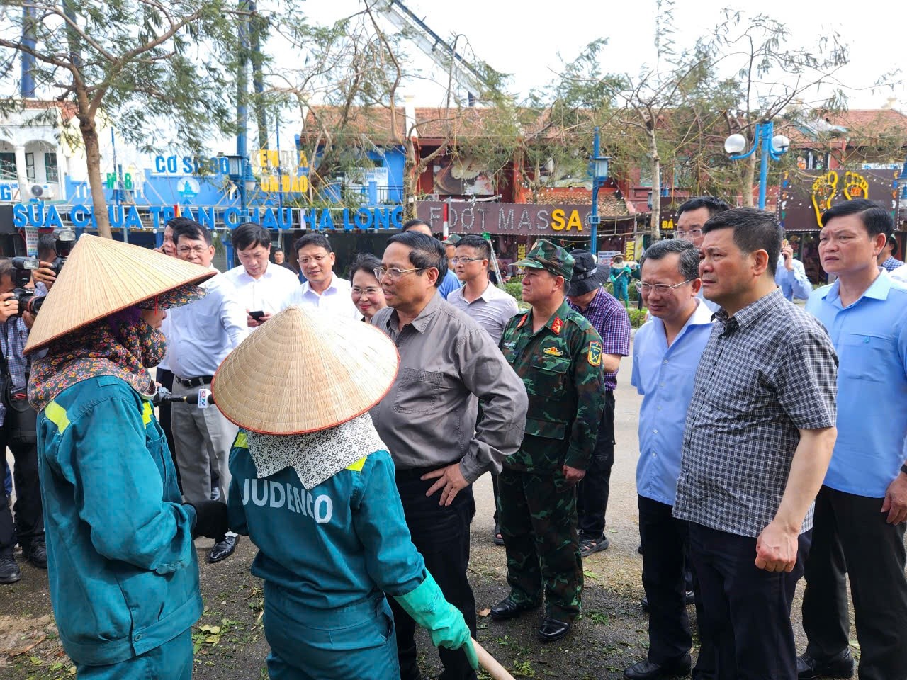| Thủ tướng ân cần động viên các công nhân môi trường đang khẩn trương khắc phục hậu quả sau bão số 3 |