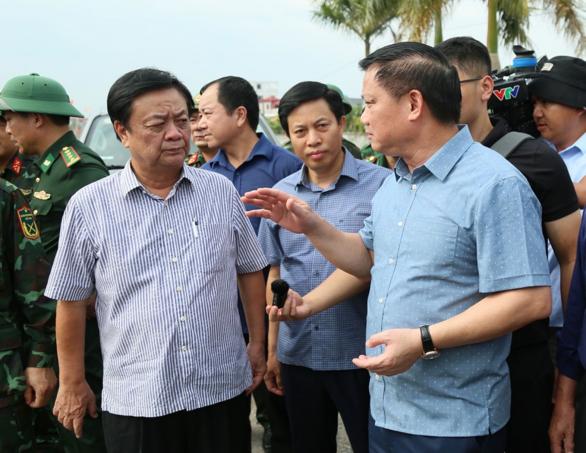 Bộ trưởng Bộ Nông nghiệp và Phát triển nông thôn Lê Minh Hoan cùng lãnh đạo tỉnh Thái Bình kiểm tra công tác ứng phó với bão số 3 tại KCN Liên Hà Thái, huyện Thái Thụy (Ảnh: CTTĐT tỉnh Thái Bình) |