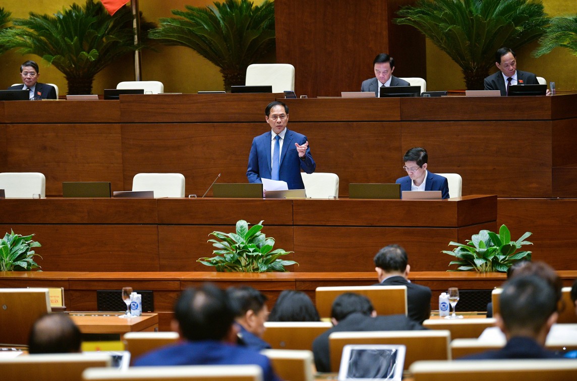 Trước đó, phát biểu mở đầu phiên chất vấn, Bộ trưởng Bộ Ngoại giao cho biết, thời gian qua, tình hình thế giới trải qua nhiều biến động, bên cạnh những thuận lợi, cũng xuất hiện nhiều khó khăn, thách thức mới gay gắt hơn trước, đặt ra nhiều nhiệm vụ mới nặng nề cho công tác đối ngoại, ngành ngoại giao. Dưới sự lãnh đạo, chỉ đạo của Trung ương Đảng, Bộ Chính trị, Ban Bí thư, đứng đầu là Tổng Bí thư Nguyễn Phú Trọng, ngành ngoại giao đã phát huy mạnh mẽ bản sắc ngoại giao cây tre Việt Nam, triển khai đồng bộ, sáng tạo trên 4 trụ cột thuộc chức năng, nhiệm vụ của Bộ Ngoại giao.