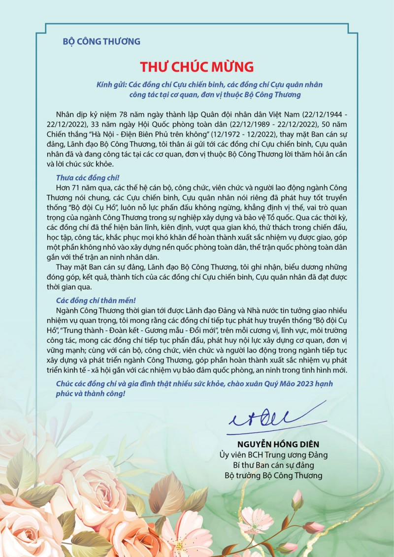 Nhân dịp kỷ niệm 78 năm ngày thành lập Quân đội Nhân dân Việt Nam (22/12/1944 - 22/12/2022), 33 năm ngày Hội Quốc phòng toàn dân (22/12/1989 - 22/12/2022), 50 năm Chiến thắng "Hà Nội - Điện Biên Phủ trên không" (12/1072 -12/2022), thay mặt Ban cán sự đảng, Lãnh đạo Bộ Công Thương, Bộ trưởng Bộ Công Thương Nguyễn Hồng Diên gửi tới các đồng chí Cựu chiến binh, Cựu quân nhân đã và đang công tác tại các cơ quan, đơn vị thuộc Bộ Công Thương lời thăm hỏi ân cần và lời chúc sức khỏe.
